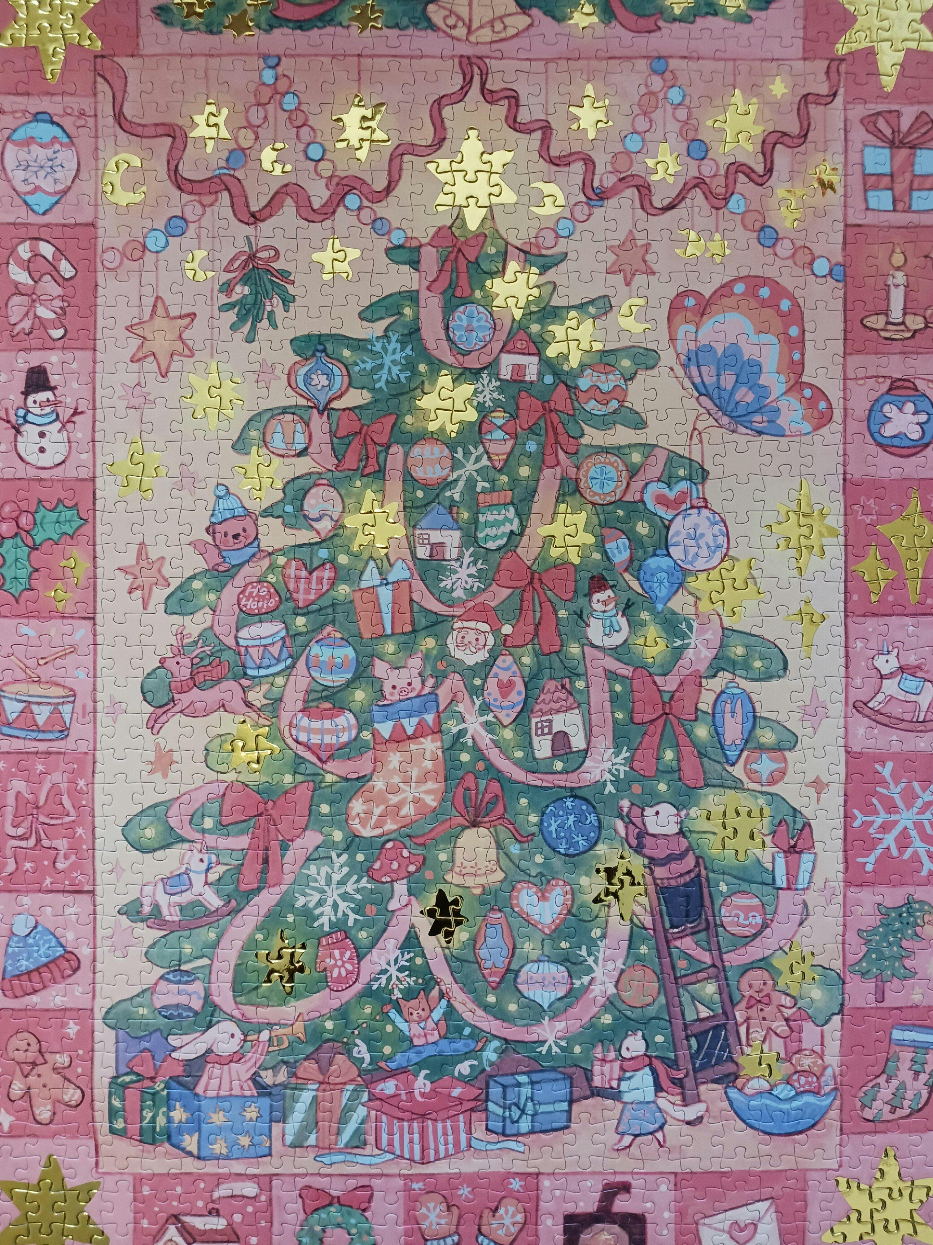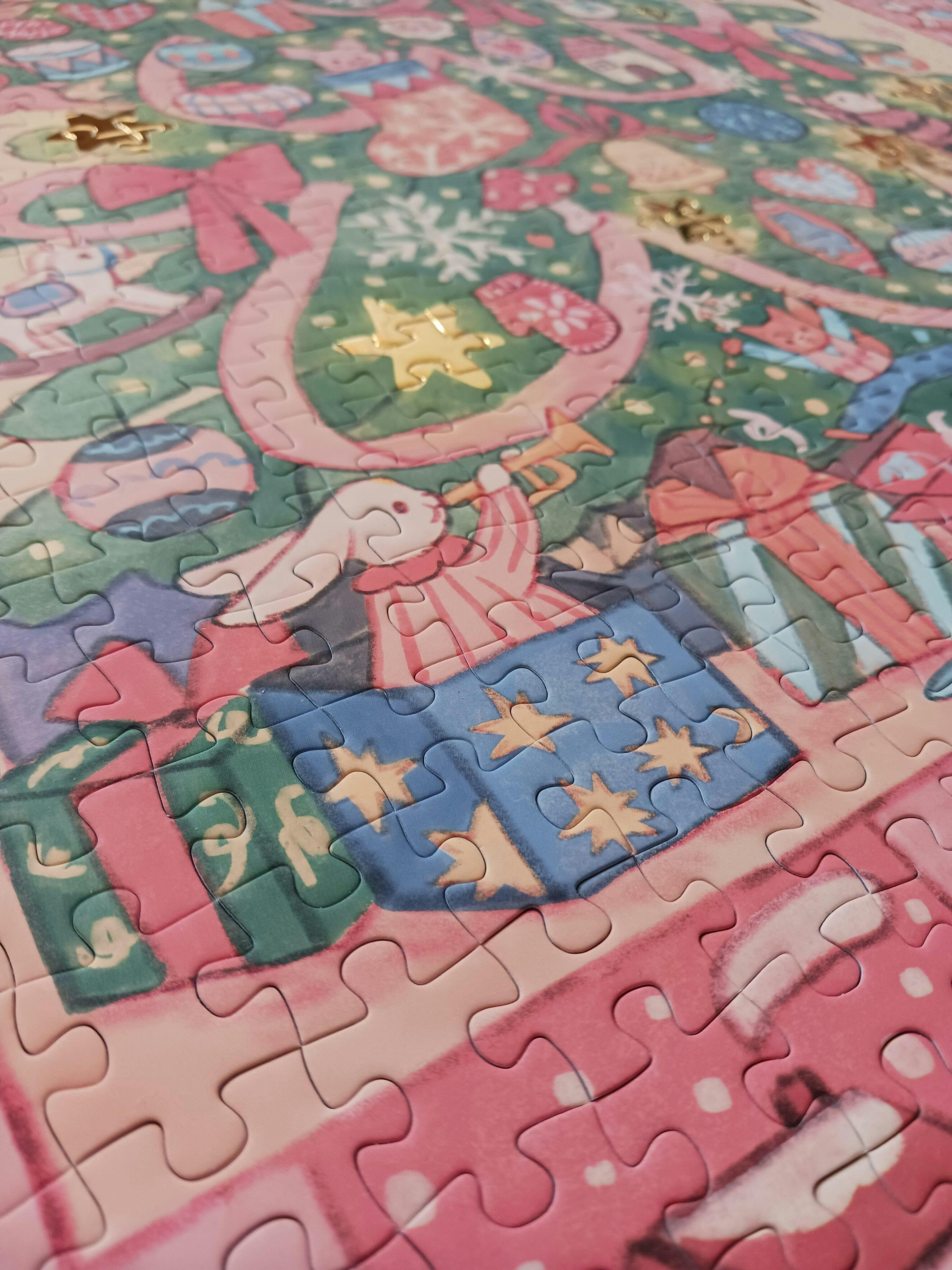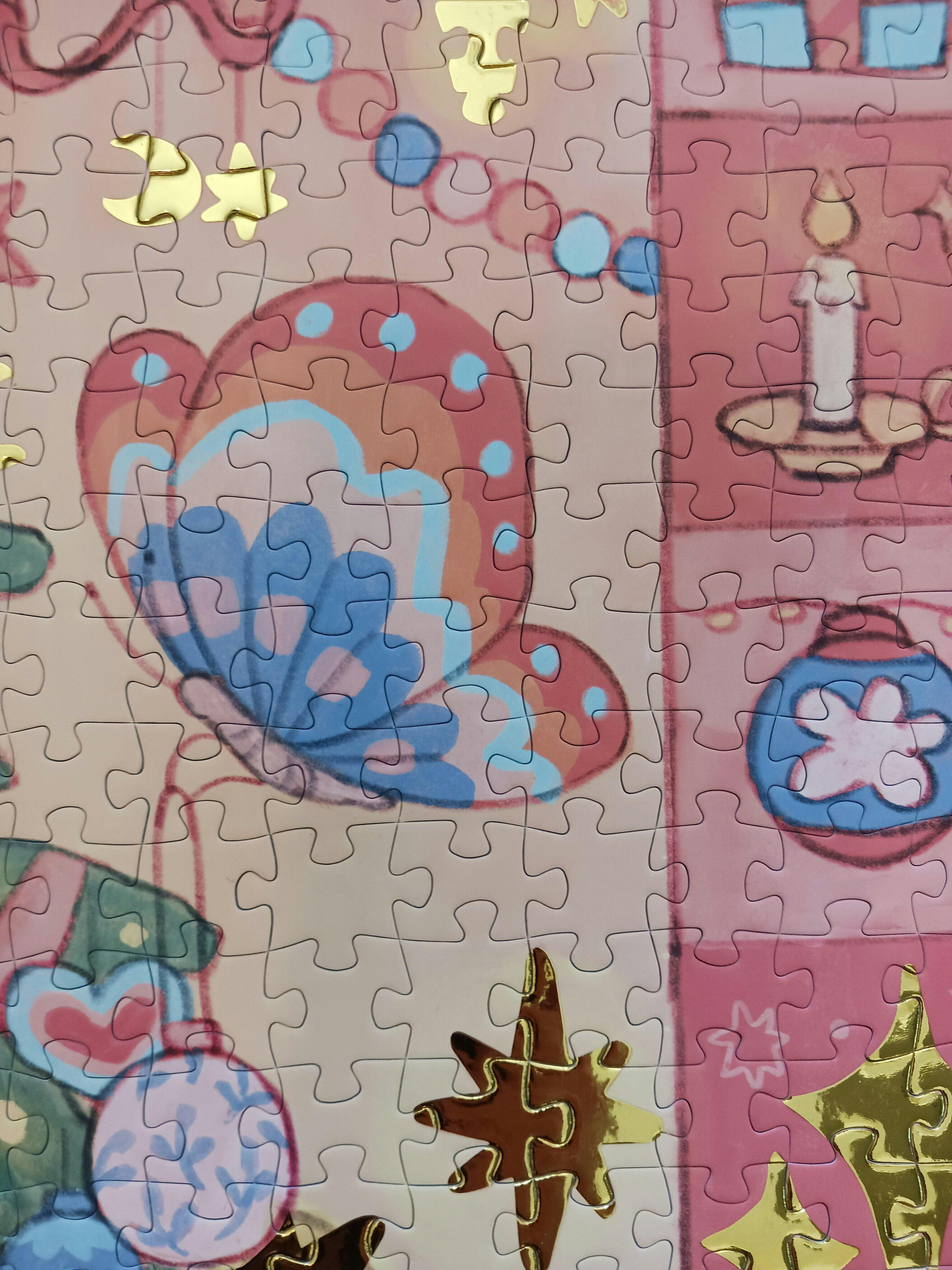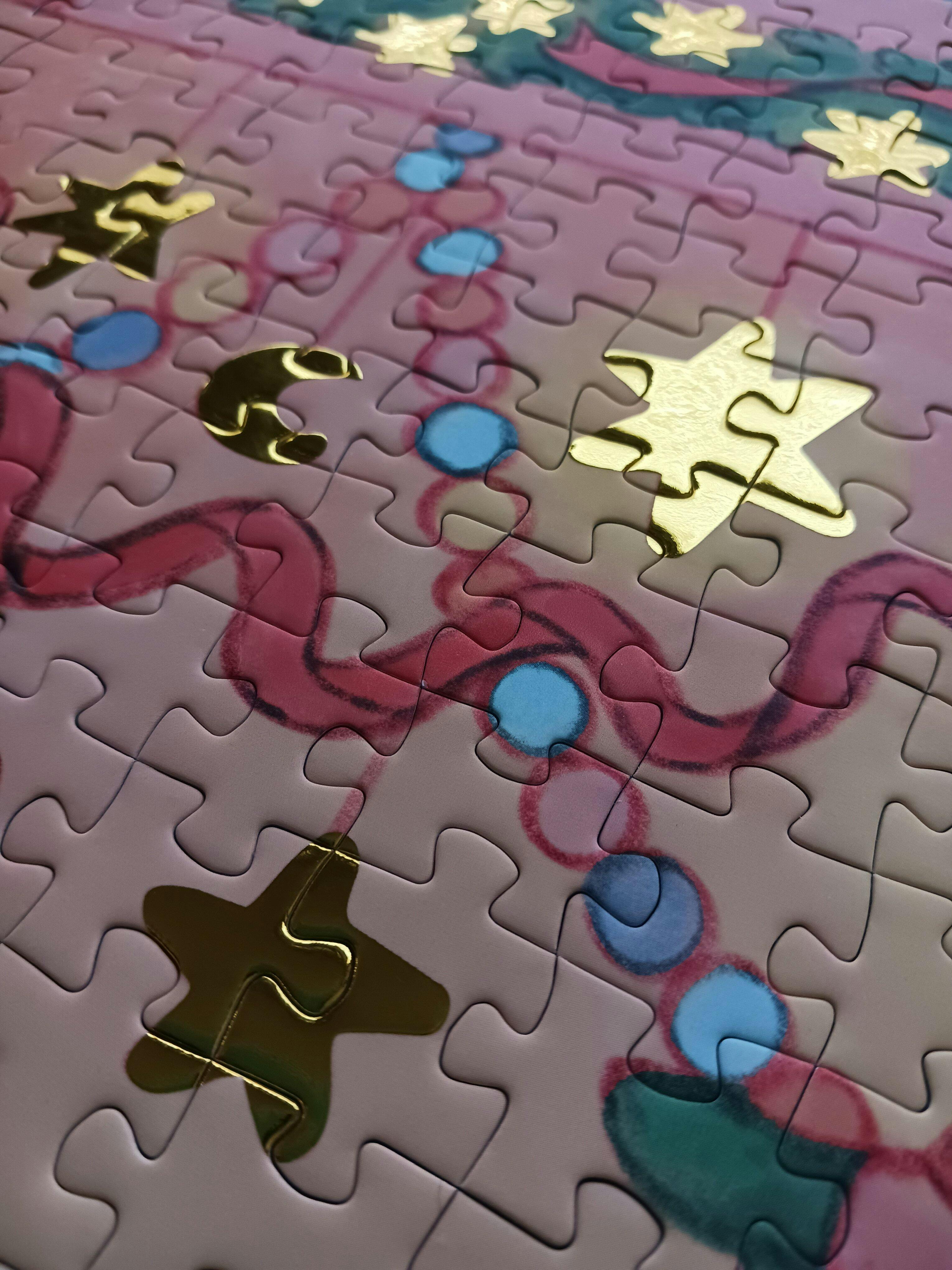 Pictures just can not properly show the beauty of this puzzle. The extremely soft touch pieces and gold foil stars are gorgeous. Even the packaging, while looking nice in photos, feels very luxurious in person.
