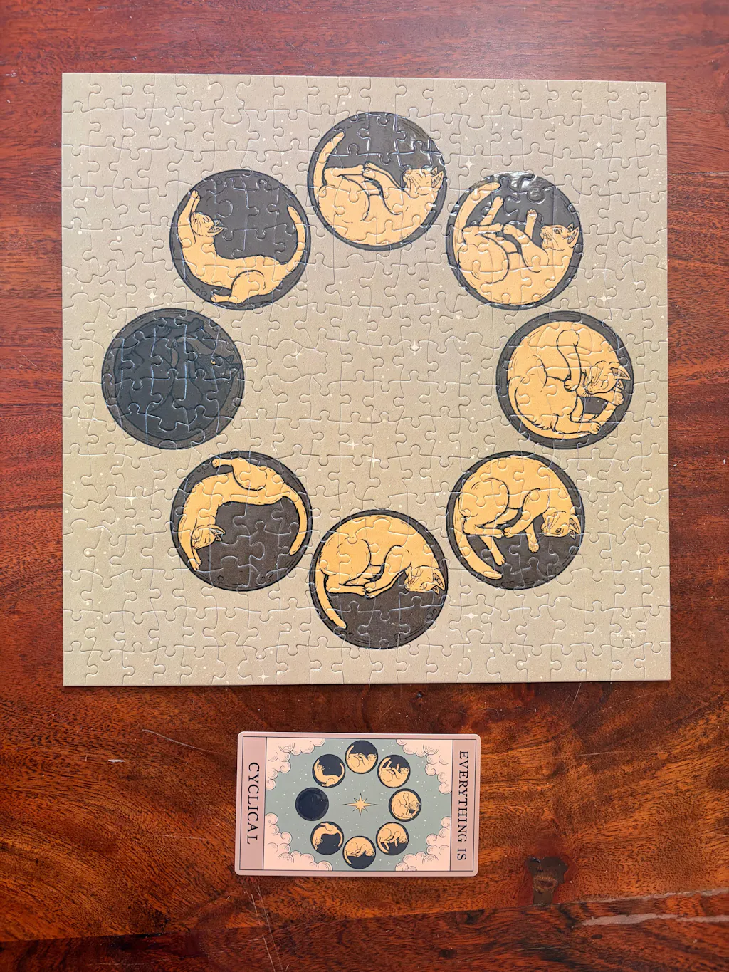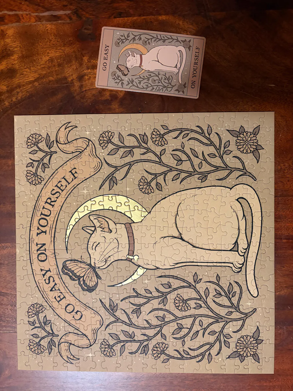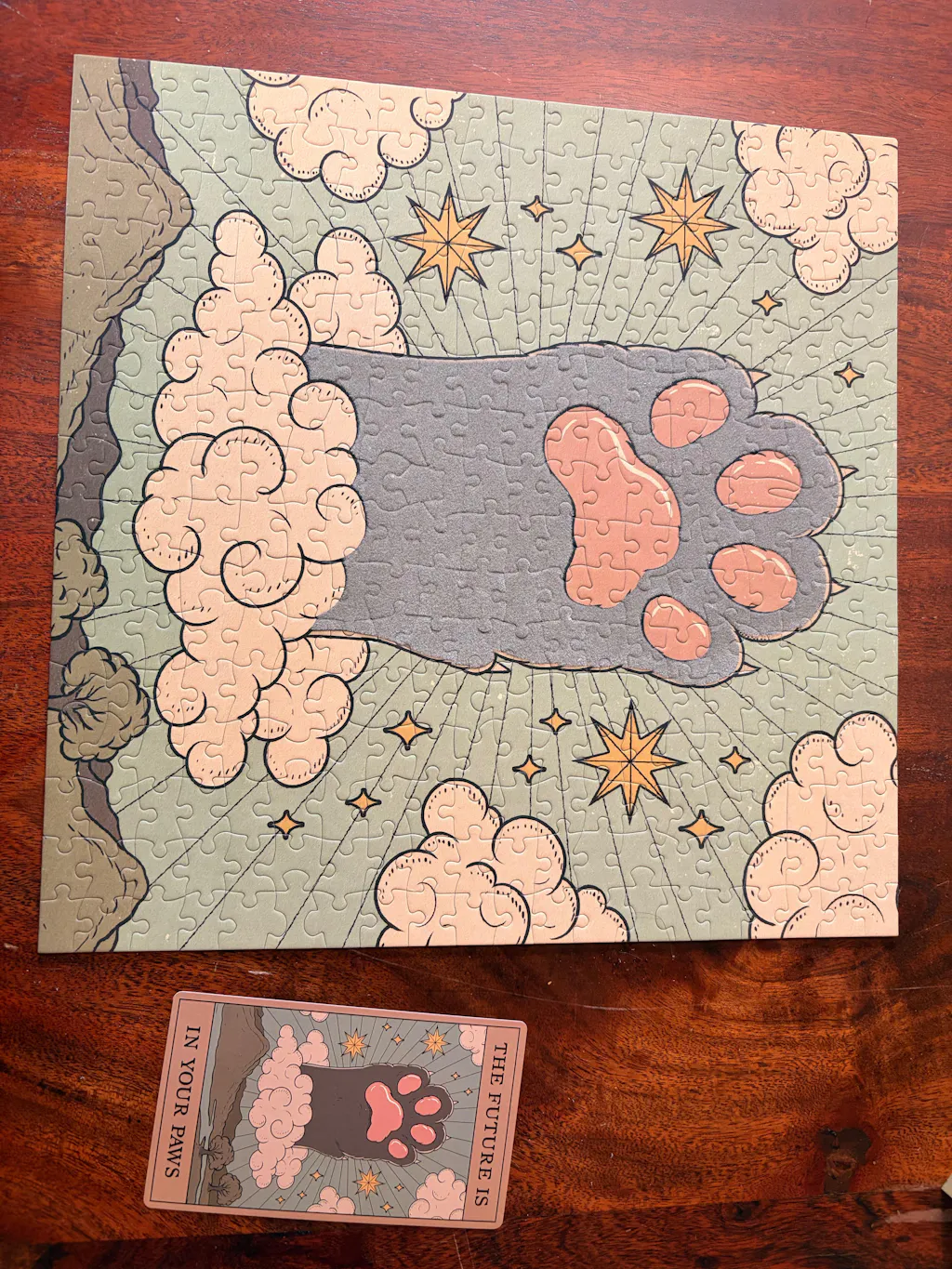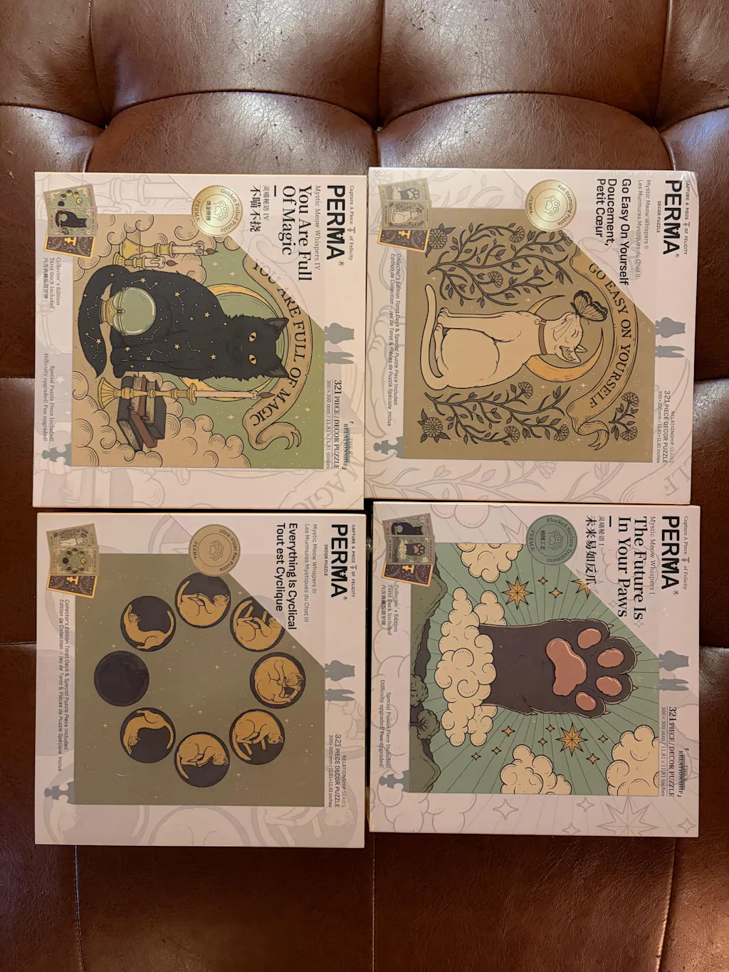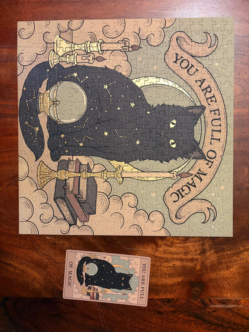 These puzzles are incredible! They have a soft matte texture, think of a nice electronics box. Each puzzle also includes a special texture, like gold foil, fuzz, or raised shine. The bonus tarot style cards that are included are very fun, and the pieces are the perfect thickness. I’m truly impressed with the quality and care that was put into the design. Customer service is also fantastic. I reached out to ask if this set would be back in stock, and they actually reached out to a retailer for me who had stock left, allowing me to order!